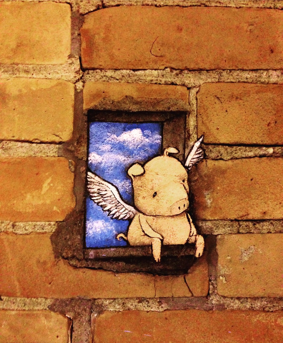 While wandering aimlessly around the city one evening, all of these thoughts muddying my clarity of mind and weighing heavily on my heart, I happened to glance up and see an illustration of a small winged pig sitting dreamily on a ledge, a beautiful blue sky to his back. Much like the message in my chocolate telling me to go to The Gambia in the first place, I am a firm believer in the universe sending us little reminders of what it is we are meant to do when we are unsure of ourselves. The wee flying pig that I saw that night seems to me that the universe has given me a sign to keep hope alive.